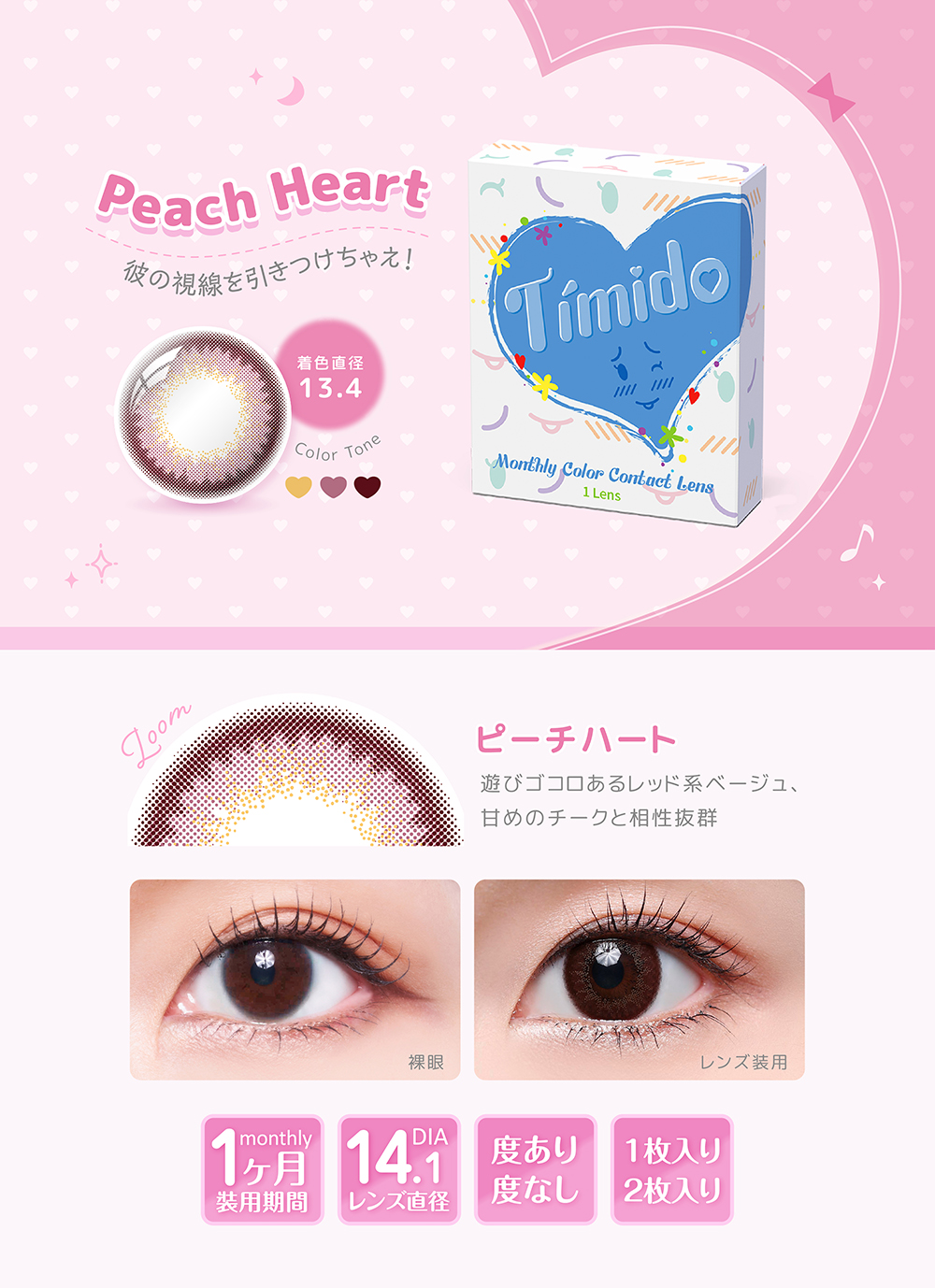 いろんな条件で探す ※検索条件アイコンを選択し、一番下にある「検索する」ボタンをクリックしてください 「色」で探す ブラック ブラウン ヘーゼル グレー ピンク レッド ゴールド オレンジ ブルー パープル グリーン クリア 「度あり・度なし」で探す 度なし 度なし 度あり 「使用期間」で探す ワンデー マンスリー ツーウィーク 「着色直径」で探す 11.9mm 12.0mm 12.5mm 12.6mm 12.7mm 12.8mm 13.0mm 13.1mm 13.2mm 13.3mm 13.4mm 13.5mm 13.6mm 13.7mm 13.8mm 14.0mm 14.1mm 14.2mm 14.3mm 14.4mm 14.6mm 「レンズ直径(DIA)」で探す 15.0mm 14.4mm 14.5mm 14.0mm 14.1mm 14.2mm 「なりたいイメージ 」から探す 透明感 ハーフ系 ナチュラル系 かわいい系 大人っぽい系 絞り込み検索 「ベースカーブ(BC)」で探す 8.6 8.7 8.5 8.9 「フチあり・なし」で探す フチあり フチなし 条件クリア 検索する おすすめ商品 Timido(ティミド) ピーチハート マンスリー 度あり 1箱1枚入り ¥ 1,150 通常価格 ¥1,150 Timido(ティミド) ピーチハート マンスリー 度なし 1箱2枚入り ¥ 1,480 通常価格 ¥1,480 Timido(ティミド) 度あり/ 度なし マンスリー DIA:14.1mm BC:8.6mm マンスリー(度なし)のご購入はこちらから ¥1480(税込) DIA14.1mm チャーミングアンバー(度なし) ¥1480(税込) DIA14.1mm ピーチハート(度なし) マンスリー(度あり)のご購入はこちらから ¥1150(税込) DIA14.1mm チャーミングアンバー(度あり) ¥1150(税込) DIA14.1mm ピーチハート(度あり) スペック 高度管理医療機器承認番号:22900BZX00215A12